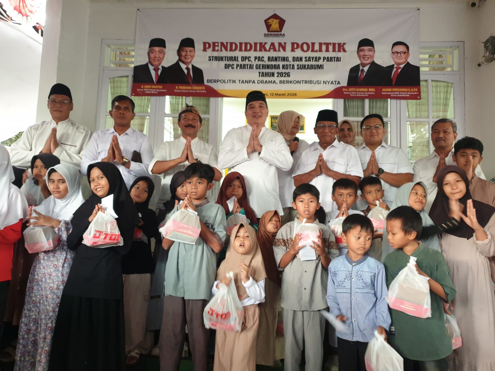 SUKABUMI – Momentum bulan suci Ramadan dimanfaatkan Dewan Pimpinan Cabang (DPC) Partai Gerindra Kota Sukabumi untuk memperkuat kepedulian sosial kepada masyarakat. Melalui kegiatan santunan anak yatim, pembagian takjil, serta buka puasa bersama, partai berlambang kepala garuda ini menghadirkan suasana kebersamaan yang hangat bersama warga.